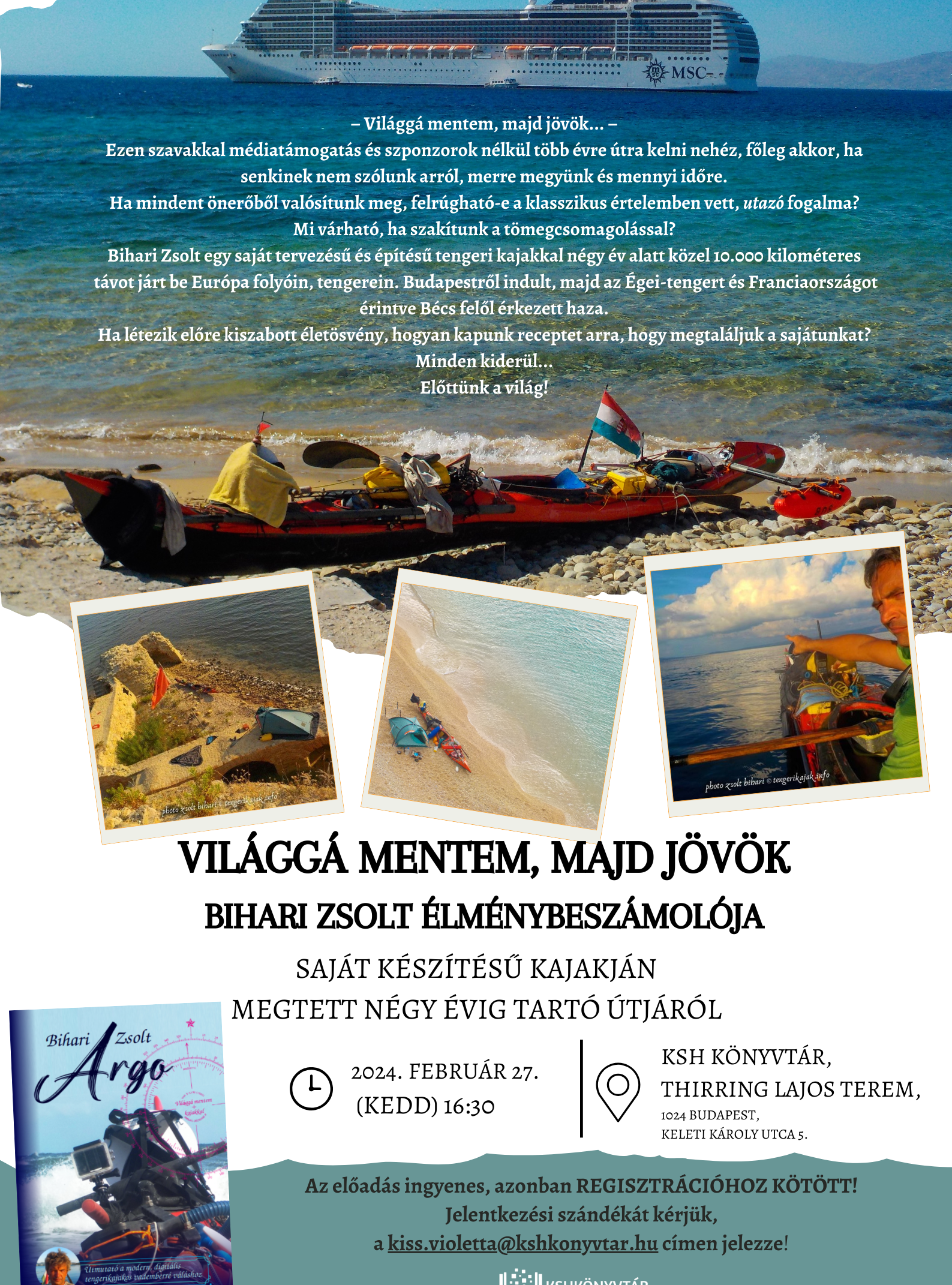 "Világgá mentem, majd jövök... – ezen szavakkal médiatámogatás és szponzorok nélkül" indult négy évig tartó útjára Bihari Zsoltsaját készítésű tengeri kajakján Európa folyóin és tengerein. Várjuk sok szeretettel mindazokat, akik kíváncsiak az Argo I. című kötet szerzőjének izgalmas és kalandos élménybeszámolójára.