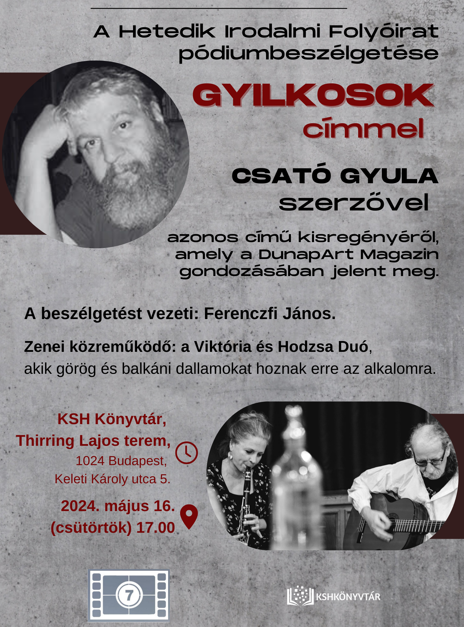 2024. május 16-án (csütörtök) 17 órától A Hetedik irodalmi folyóirat Pódiumbeszélgetése kerül megrendezésre GYILKOSOK címmel CSATÓ GYULA szerzővel, azonos című kisregényéről, amely a DunapArt Magazin gondozásában jelent meg.