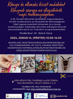 2024. június 14-én (péntek) 13.00 és 16.00 óra között várjuk az érdeklődő kicsiket és nagyokat a Könyv és olvasás kicsit másként – Könyvek szerepe az olvasókörök napi tevékenységében című rendezvényünkre!