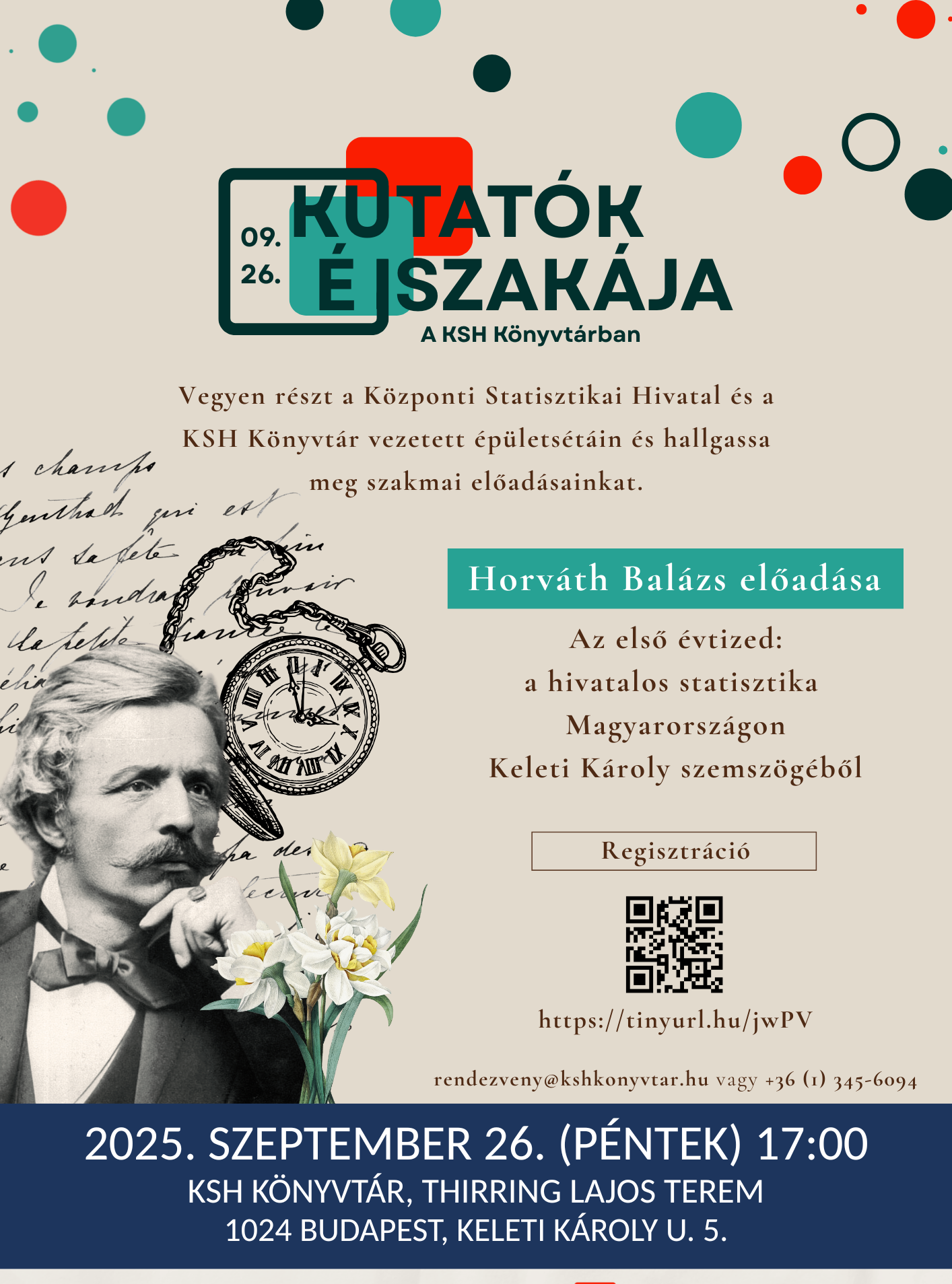 17:00 órától Horváth Balázs kollégánk tart előadást „Az első évtized: a hivatalos statisztika Magyarországon Keleti Károly szemszögéből” címmel, betekintést nyújtva a hazai statisztika korai időszakába.