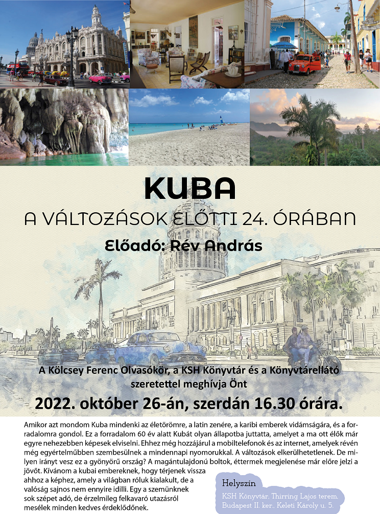 2022. október 26-án (szerdán) 16:30 órától szeretettel várja az érdeklődőket a Kölcsey Ferenc Olvasókör, a KSH Könyvtár és a KönyvtárellátóKuba a változások előtti 24. órában című rendezvényére.