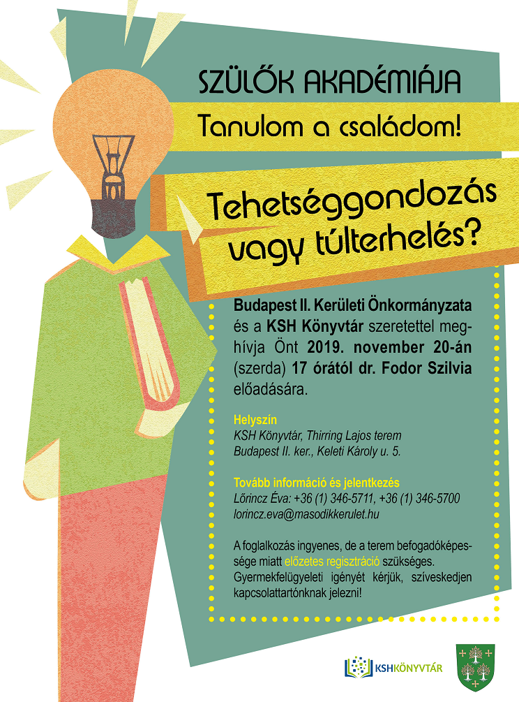 2019. november 20-án (szerdán) 17 órakor dr. Fodor Szilvia pszichológus, a Debreceni Egyetem oktatója tart előadást "Tehetséggondozás vagy túlterhelés?" címmel a Szülők Akadémiája soron következő rendezvényén.