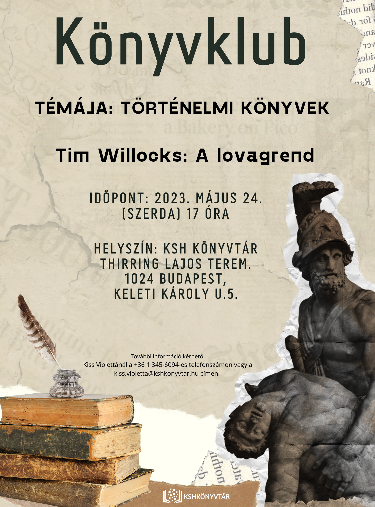 2023. május 24-én (szerda) 17 órától sok szeretettel vár mindenkit a KSH Könyvtár könyvklubja! Az est során Tim Willocks A lovagrend című művét dolgozzuk fel, a klub témája: Történelmi könyvek. Helyszín: Thirring Lajos terem