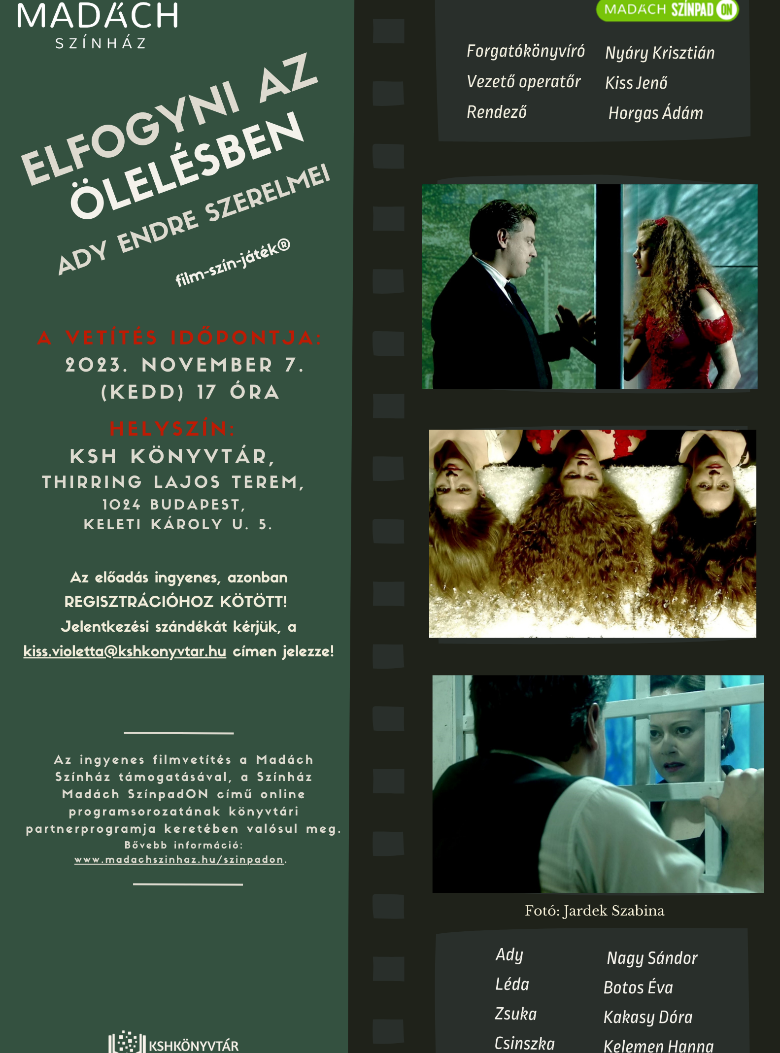 Szeretettel várunk minden színházkedvelőt és érdeklődőt 2023. november 7-én (kedd) 17 órától a Madách Színház Írók-Sorsok-Szerelmek című online irodalmi programsorozatának Elfogyni az ölelésben – Ady Endre szerelmei című film-szín-játékára.
