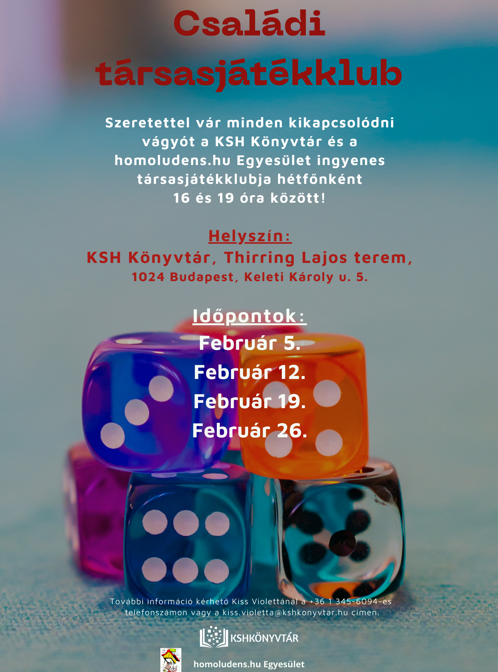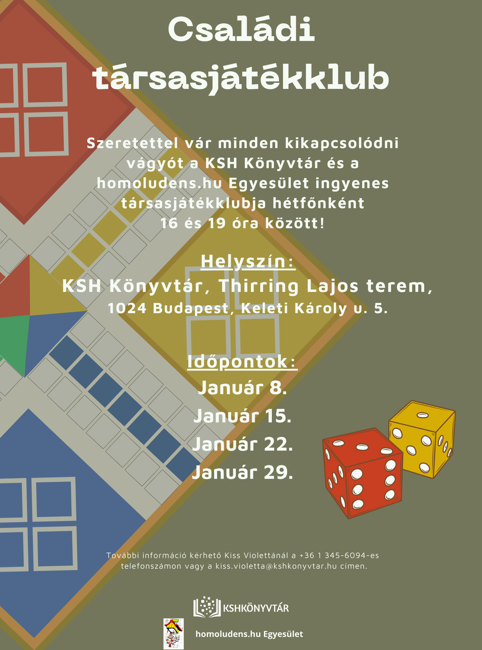 Szeretettel várja az érdeklődő kicsiket és nagyokat a KSH Könyvtár és a homoludens.hu Egyesület közös rendezésű családi társasjátékklubja hétfőnként 16 és 19 óra között.