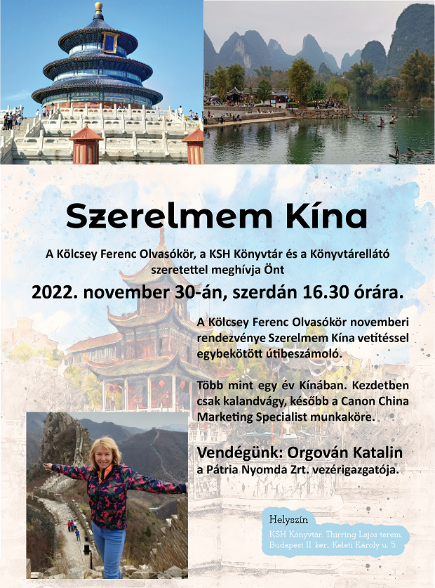 2022. november 30-án (szerdán) 16:30 órától szeretettel várja az érdeklődőket a Kölcsey Ferenc Olvasókör, a KSH Könyvtár és a Könyvtárellátó Szerelmem Kína című rendezvényére. Több mint egy év Kínában. Kezdetben csak kalandvágy, később a Canon China Marketing Specialist munkaköre.