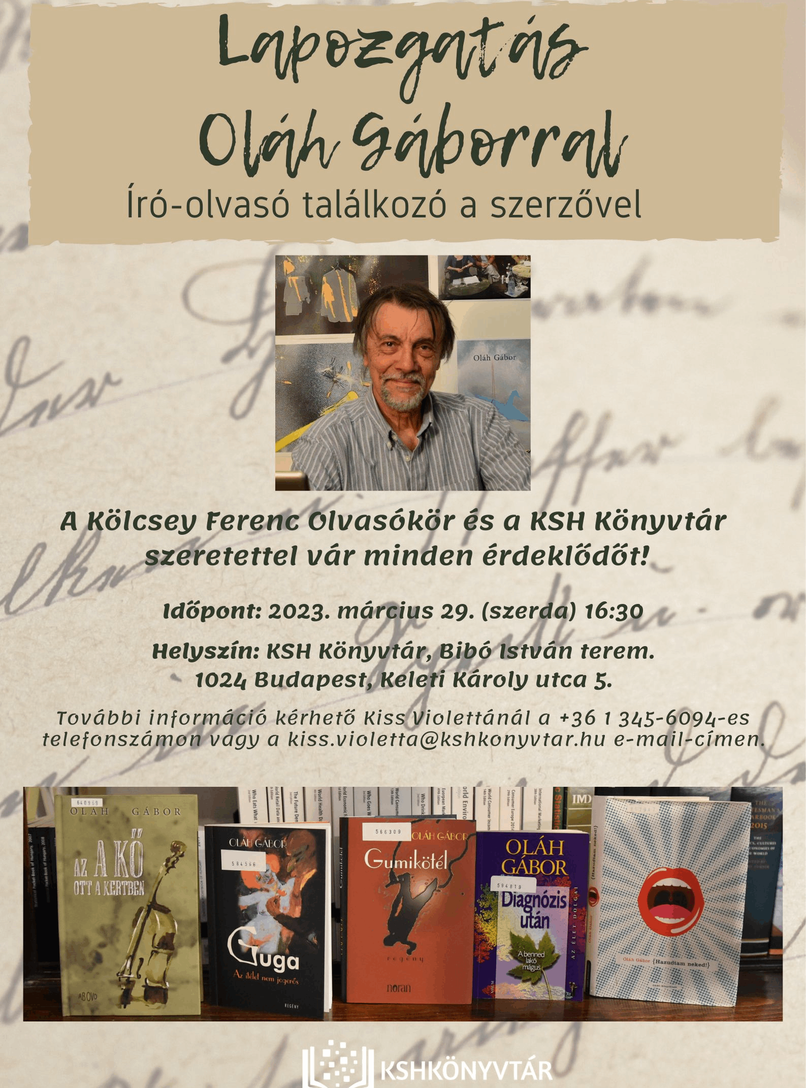 2023. március 29-én (szerdán) 16:30 órától szeretettel várja az érdeklődőket a Kölcsey Ferenc Olvasókör és a KSH Könyvtár Lapozgatás Oláh Gáborral. Író-olvasó találkozó a szerzővel című rendezvényére.