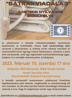 A Hetedik című irodalmi folyóirat műhelymunkájába nyerhetünk bepillantást 2023. február 15-én (szerda) 17 órakor egy nyílt szerkesztőségi ülés keretében, mely a „Bátrak viadala 3” címmel kerül megrendezésre.