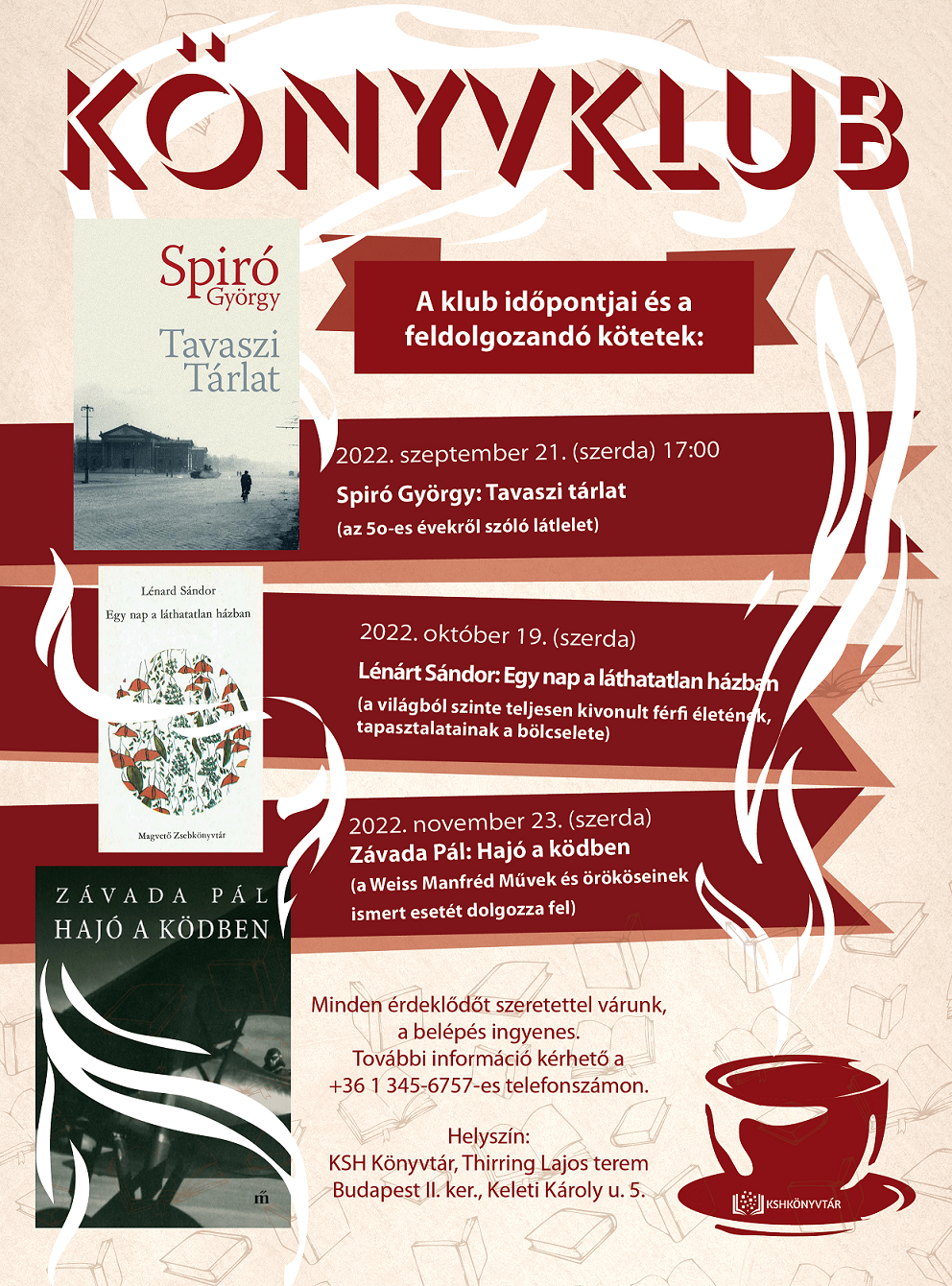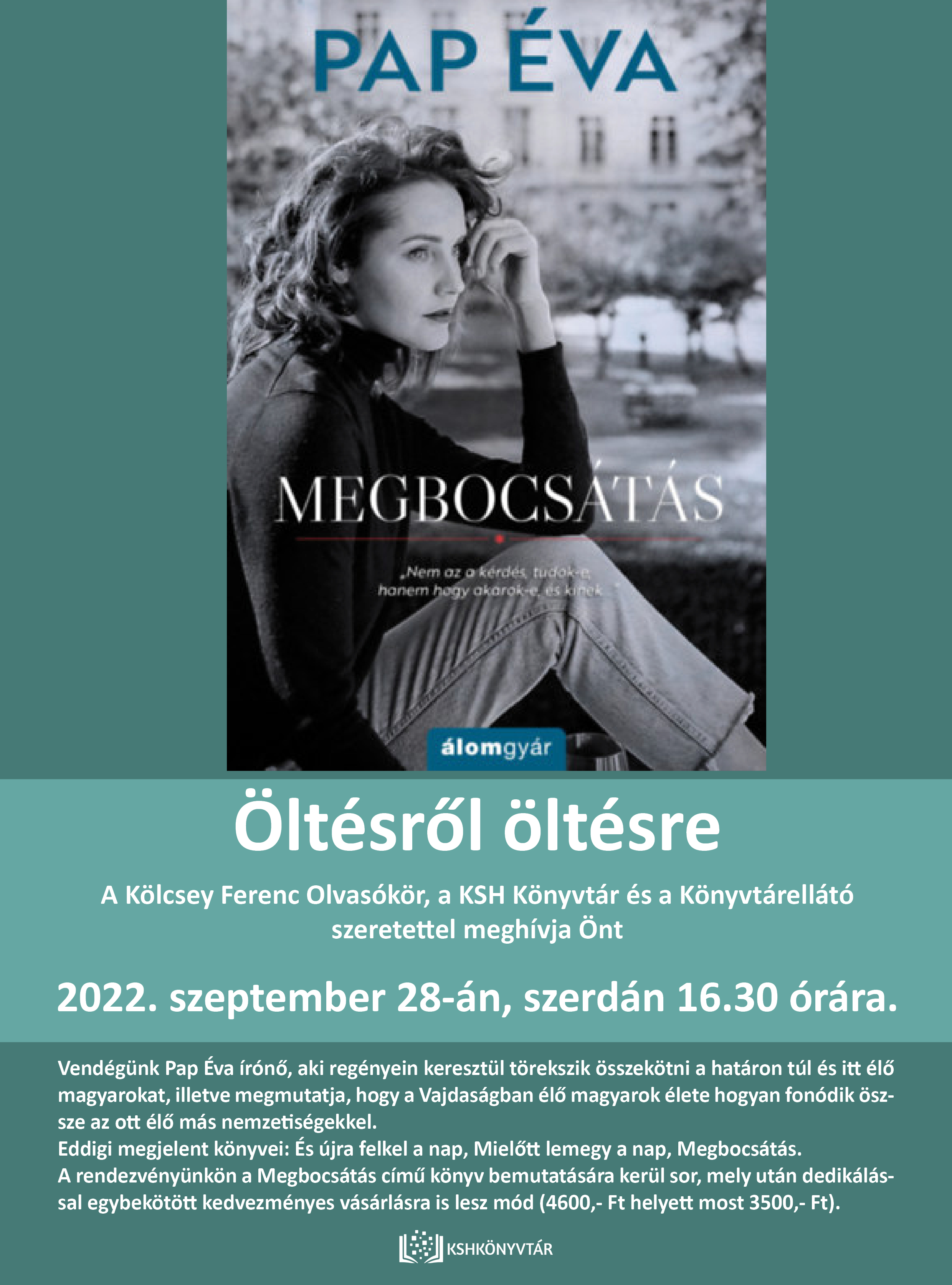 2022. szeptember 28-án (szerdán) 16:30 órától szeretettel várja az érdeklődőket a Kölcsey Ferenc Olvasókör, a KSH Könyvtár és a Könyvtárellátó Pap Éva írónő Öltésről öltésre című estjére, aki kötetein keresztül a határon túli és idehaza élő magyarokat igyekszik összekötni, illetve bemutatni a Vajdaságban élő magyarok és más, ott élő nemzetiségek életének összefonódását.