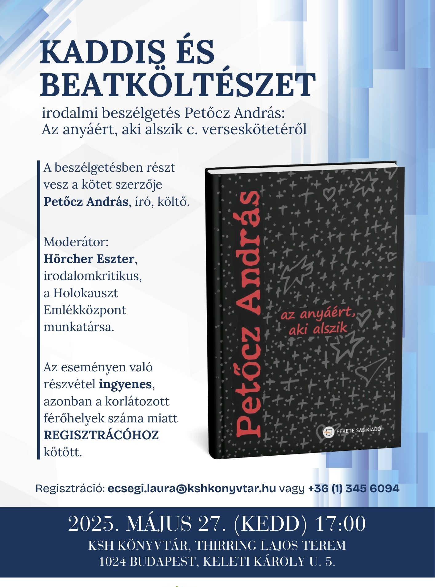 A KSH Könyvtár szeretettel várja a kedves érdeklődőket egy irodalmi beszélgetésre Petőcz András: Az anyáért, aki alszik c. verseskötetéről, amely május 27-én 17 órakor kerül megrendezésre.